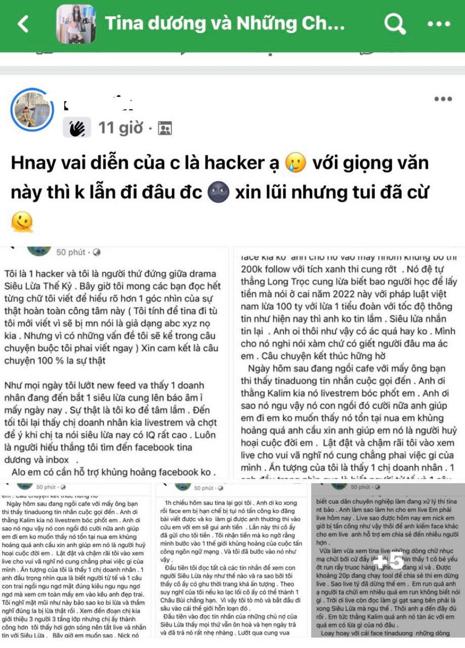 Tuy nhiên, sau livetream này, cộng đồng mạng liên tục "ném đá" cô và cho rằng, cô có cả ekip đứng đằng sau "giật dây". Thông tin về vấn đề này, mới đây, Tina Duong đã đăng tải dòng trạng thái trên trang Facebook cá nhân: "Em xin được đính chính lại là em không có ekip, không có đồng bọn đồng phạm nào ở đây cả. Em tố cáo chị L.T.H.N (tức chị N.L) về hành vi vu khống em lừa gia đình chị 17 tỷ đồng, với 300 nạn nhân, và khoảng 100 tỷ của các nạn nhân khác. Phóng đại và bôi nhọ đời sống cá nhân và kêu gọi hội đồng đàn áp mạt sát tinh thần em".