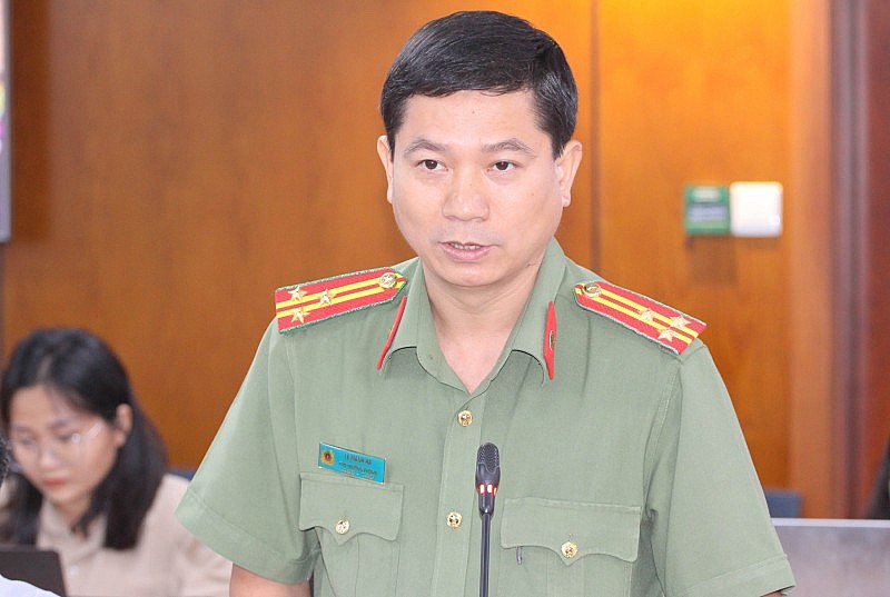 | Thượng tá Lê Mạnh Hà - Phó Trưởng Phòng Tham mưu Công an TP. Hồ Chí Minh, trả lời cầu hỏi của phóng viên liên quan đến hoạt động mua bán nợ, tín dụng đen, tại họp báo chiều tối ngày 29/6/2023 |