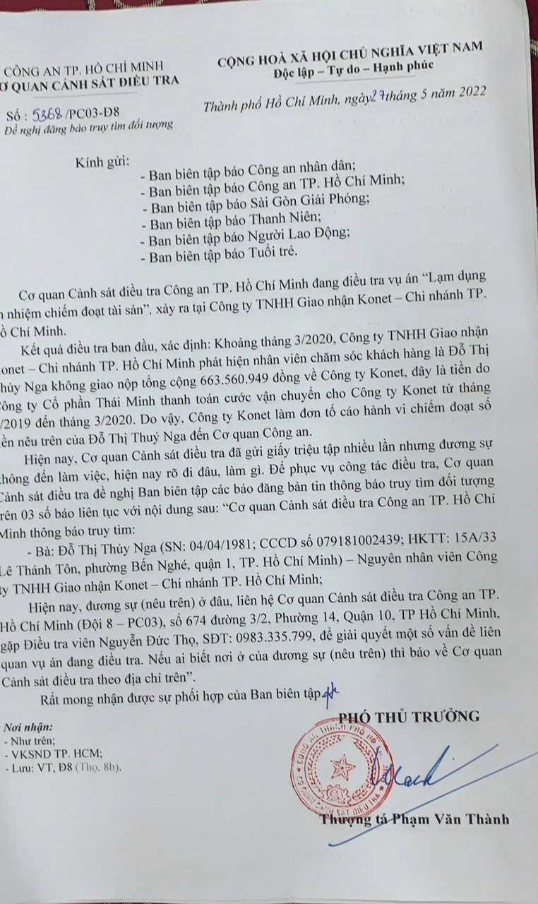 | Văn bản Công an TP.HCM gửi báo chí truy tìm nhân viên Công ty TNHH giao nhận Konet (Chi nhánh TP.HCM) |