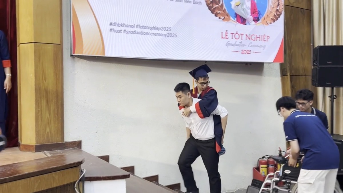 Chiều ngày 10/5, hội trường Đại học Bách khoa Hà Nội lặng đi khi Ngô Văn Hiếu, chàng sinh viên Y khoa năm thứ 5 ở Thái Bình, nhẹ nhàng cúi xuống, luồn tay dưới lưng Nguyễn Tất Minh và cõng bạn bước lên nhận bằng tốt nghiệp. Tiếng vỗ tay rộn ràng, nhưng điều đọng lại sâu nhất là hơi ấm của một tình bạn kéo dài suốt 15 năm.