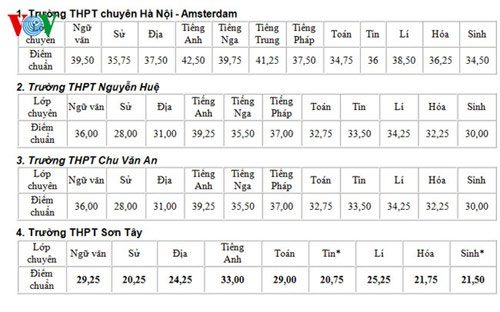 Năm học 2015-2016, Hà Nội có 4 trường THPT có tuyển sinh HS vào các lớp 10 chuyên, gồm: THPT chuyên Hà Nội - Amssterdam, THPT chuyên Nguyễn Huệ, THPT Chu Văn An, THPT Sơn Tây.