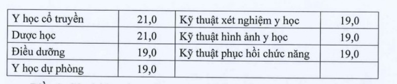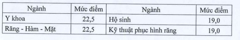 Với nhóm ngành sức khỏe có cấp chứng chỉ hành nghề, ngưỡng đảm bảo chất lượng ngành Y khoa và Răng - Hàm - Mặt là 22,5 điểm; ngành Dược học và Y học cổ truyền 21 điểm; các ngành gồm: Điều dưỡng, Y học dự phòng, Hộ sinh, Kỹ thuật xét nghiệm y học, Kỹ thuật hình ảnh y học, Kỹ thuật phục hồi chức năng, Kỹ thuật phục hình răng là 19 điểm.