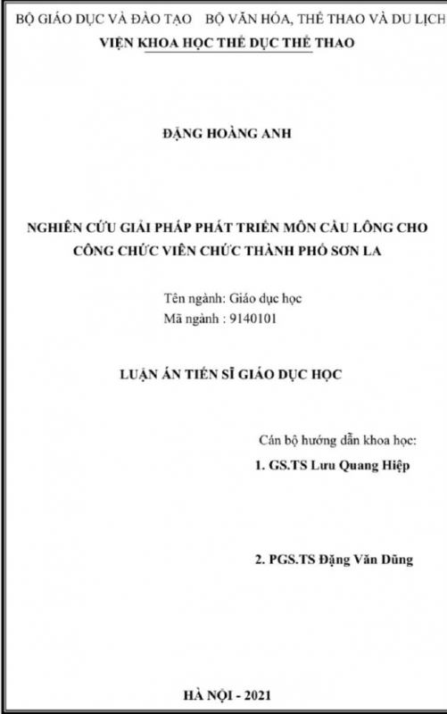 Đầu tháng 5 vừa qua, các diễn đàn học thuật trên mạng xã hội có nhiều ý kiến băn khoăn về luận án tiến sĩ "Nghiên cứu giải pháp phát triển môn cầu lông cho công chức viên chức thành phố Sơn La", thuộc chuyên ngành Giáo dục học tại Viện Khoa học Thể dục Thể thao (Tổng cục Thể dục Thể thao, Bộ Văn hóa - Thể thao và Du lịch), của Nghiên cứu sinh (NCS) Đặng Hoàng Anh.