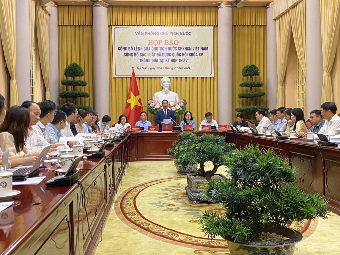 Các luật được công bố tại buổi họp báo đã được Quốc hội khoá XV, Kỳ họp thứ 7 thông qua, gồm: Luật Đường bộ; Luật sửa đổi, bổ sung một số điều của Luật Đấu giá tài sản; Luật Thủ đô; Luật Bảo hiểm xã hội; Luật sử đổi, bổ sung một số điều của Luật Đất đai số 31/2024/QH15, Luật Nhà ở số 27/2023/QH15, Luật Kinh doanh bất động sản số 29/2023/QH15 và Luật Các tổ chức tín dụng số 32/2024/QH15. Đồng chí Phạm Thanh Hà- Phó Chủ nhiệm Văn phòng Chủ tịch nước chủ trì họp báo.