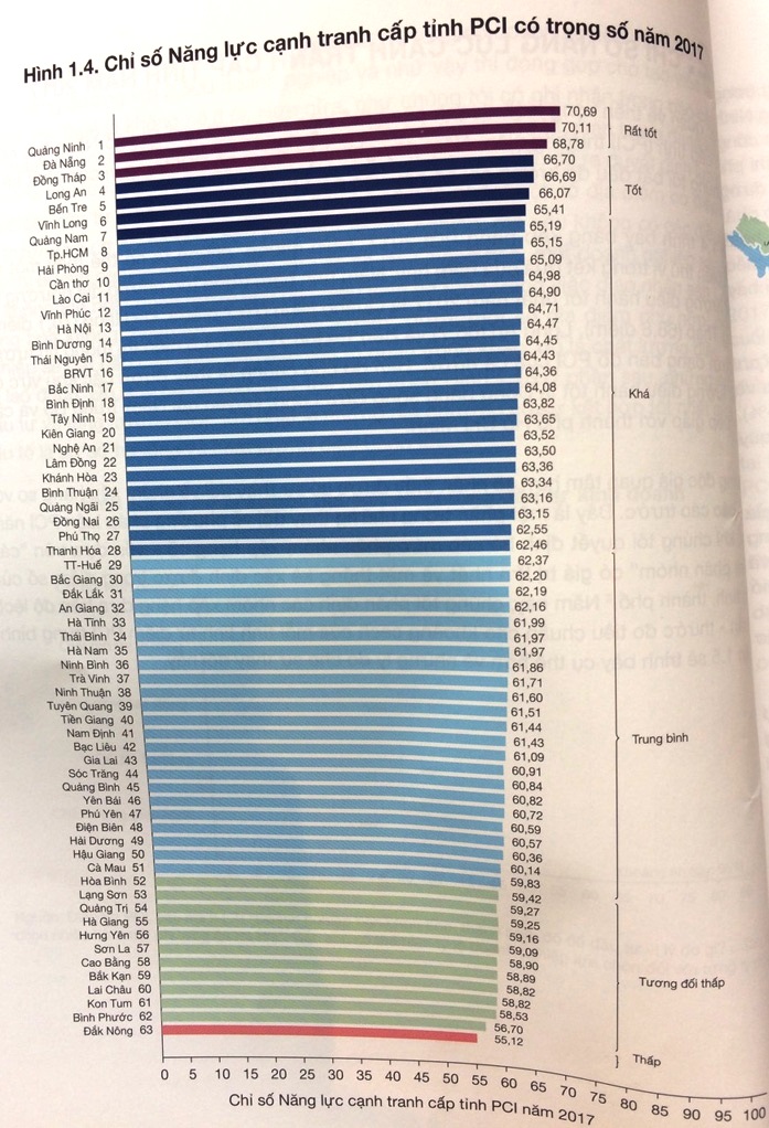 Trong bảng xếp hạng PCI 2017, Quảng Ninh lần đầu vươn lên đứng vị trí số 1 trên bảng xếp hạng PCI 2017. Điểm số Quảng Ninh đạt được là 70,7 trên thang điểm 100. Năm ngoái, Quảng Ninh ở vị trí số 2, còn Đà Nẵng dẫn đầu. Những địa phương khác trong nhóm 10 tỉnh, thành phố có chất lượng điều hành tốt nhất năm 2017 là Đà Nẵng (70,1 điểm), Đồng Tháp, Long An, Bến Tre, Vĩnh Long, Quảng Nam, TP. Hồ Chí Minh, Hải Phòng và Cần Thơ. Các địa phương nằm trong nhóm xếp hạng cao còn có Lào Cai, Vĩnh Phúc, Hà Nội, Bình Dương, Thái Nguyên, Bắc Ninh,...
