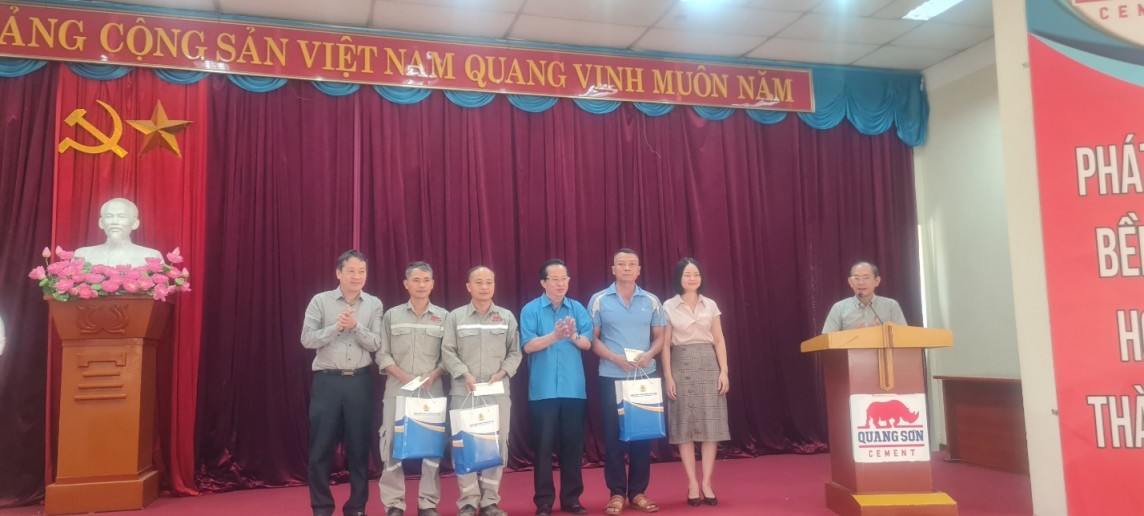 | Đại diện Công đoàn Công Thương Việt Nam, Công đoàn Tổng Công ty cổ phần Xây dựng Công nghiệp Việt Nam tặng quà đoàn viên, người lao động Công ty TNHH MTV Xi măng Quang Sơn |