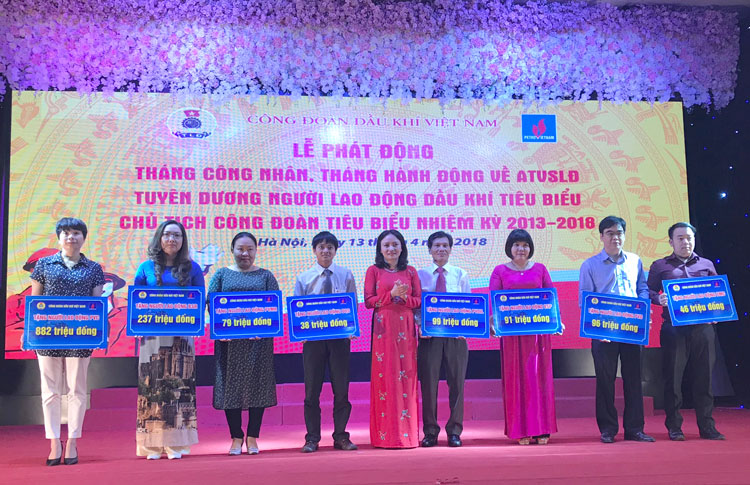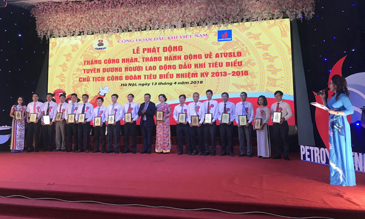 Tại buổi lễ, Công đoàn Dầu khí Việt Nam đã tuyên dương 49 lao động dầu khí tiêu biểu và 33 chủ tịch công đoàn tiêu biểu có nhiều đóng góp xuất sắc trong 5 năm (2013-2018). |