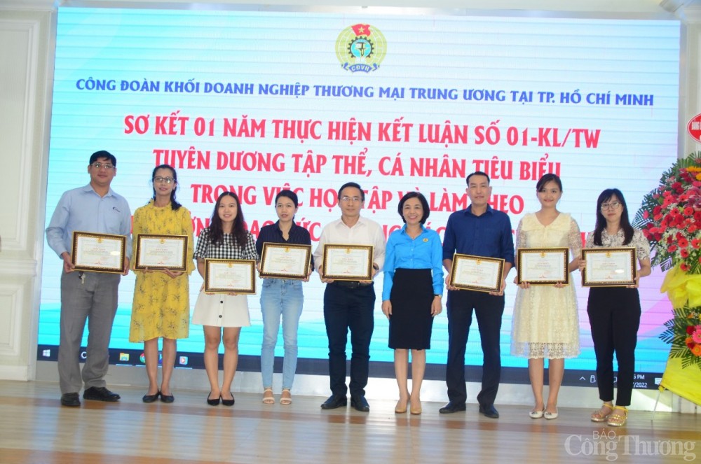 | Bà Nguyễn Thị Thanh Mai - Phó Chánh Văn phòng, phụ trách Văn phòng Công đoàn Công Thương phía Nam trao bằng khen tuyên dương tập thể, cá nhân tiêu biểu trong việc học tập và làm theo tư tưởng, đạo đức, phong cách Hồ Chí Minh. Ảnh: Việt Hùng |