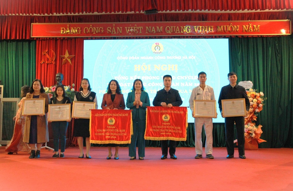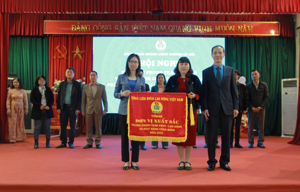 | Ông Vũ Trường Sơn - Phó Chủ tịch Công đoàn Công Thương Việt Nam và đại diện Liên đoàn Lao động TP. Hà Nội trao Cờ thi đua xuất sắc cho các đơn vị |