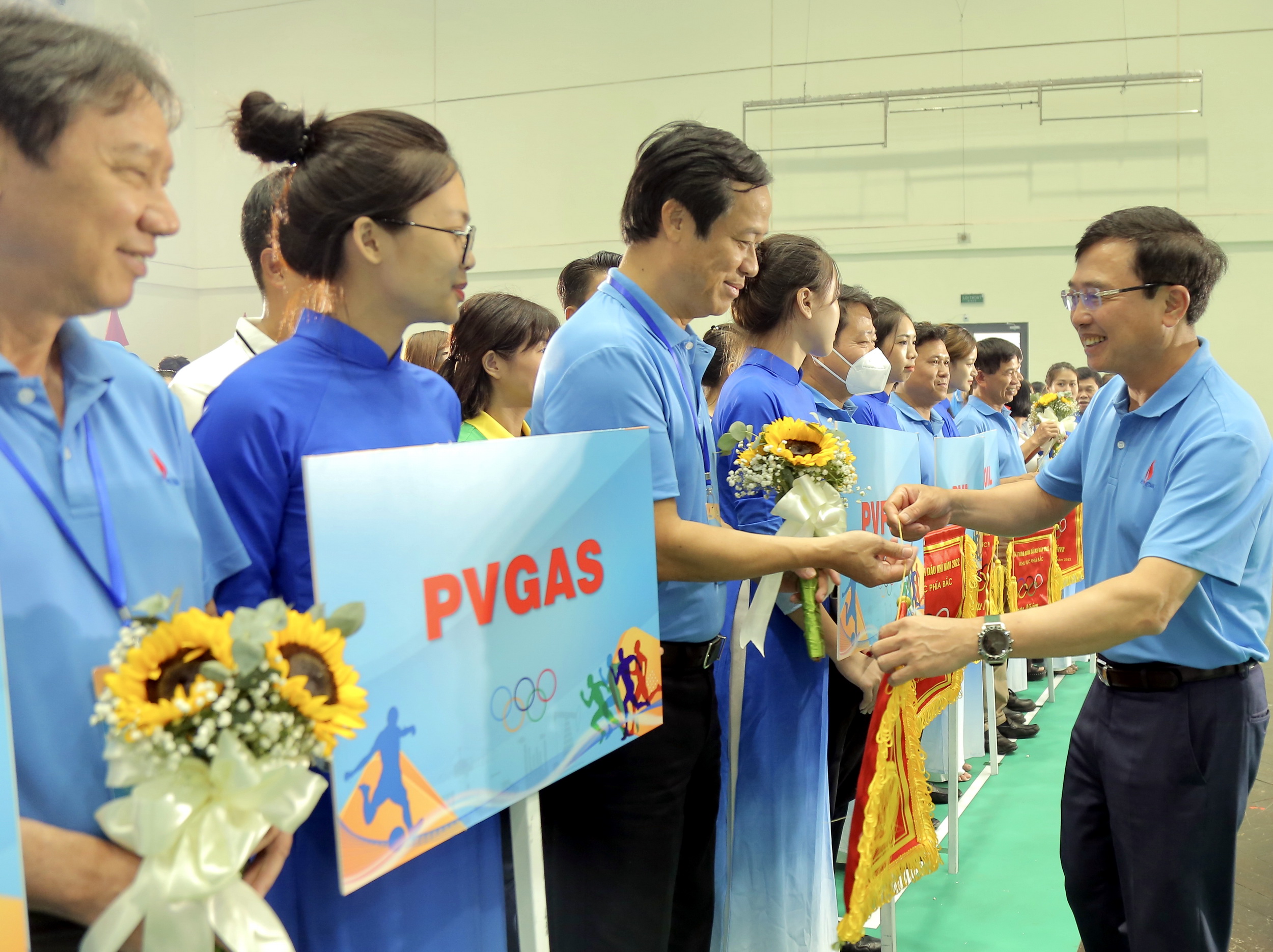 | Bí thư Đảng ủy, Chủ tịch Hội đồng thành viên Hoàng Quốc Vượng trao cờ lưu niệm cho đoàn thể thao PV GAS tham gia Hội thao ngành Dầu khí 2022 – Khu vực miền Bắc |