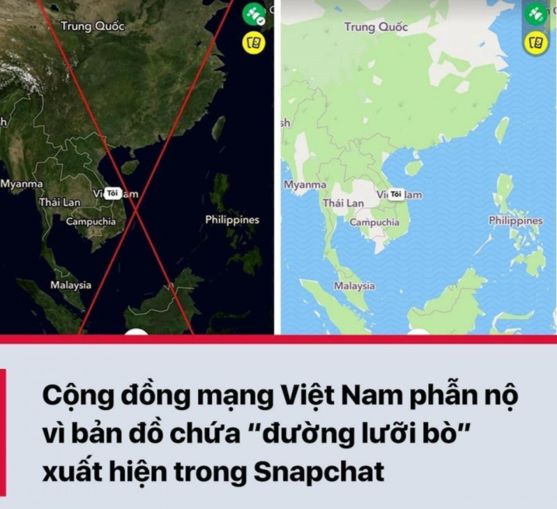 Những ngày qua, đông đảo người dùng trên các hội, nhóm mạng xã hội chia sẻ, kêu gọi cùng nhau tẩy chay ứng dụng mạng xã hội Snapchat vì hiển thị bản đồ có chứa “đường lưỡi bò" phi pháp, xâm hại nghiêm trọng chủ quyền Việt Nam trên không gian mạng.