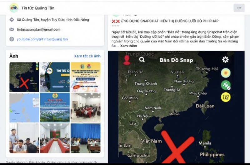 Trên một fanpage đưa tin: “Ứng dụng SnapChat hiển thị đường lưỡi bò phi pháp” kèm nội dung: Ngày 5/11/2023, khi truy cập phần "Bản đồ" trong ứng dụng Snapchat trên điện thoại sẽ hiển thị "Đường lưỡi bò" phi pháp chiếm gần trọn Biển Đông, xâm phạm nghiêm trọng chủ quyền của Việt Nam đối với hai quần đảo Trường Sa và Hoàng Sa".