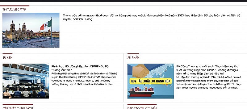 Cụ thể, hiện Cổng thông tin FTAP đã khởi động các chuyên mục về CPTPP, như: Thông tin về CPTPP; các sự kiện liên quan đến CPTPP, cập nhật chính sách về CPTPP như Nghị định số 21/2022/NĐ-CP ngày 10 tháng 3 năm 2022 về Biểu thuế xuất khẩu ưu đãi, biểu thuế nhập khẩu ưu đãi đặc biệt để thực hiện Hiệp định CPTPP giai đoạn 2019-2022; Ấn phẩm cung cấp thông tin về quy tắc xuất xứ của CPTPP; mục đào tạo thường xuyên đăng tải chuỗi video ngắn giúp bạn nhanh chóng tìm hiểu Hiệp định CPTPP; dữ liệu thống kê cung cấp số liệu về xuất nhập khẩu hai chiều…