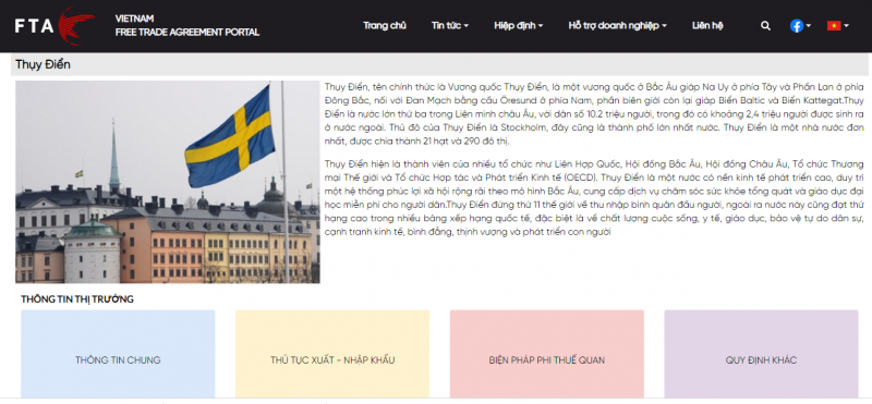 Tại địa chỉ: https://fta.gov.vn/index.php?r=site%2Fcountry-profile&id=215 trên Cổng thông tin về các hiệp định thương mại tự do của Việt Nam (FTAP) sẽ giúp hỗ trợ doanh nghiệp Việt Nam nắm bắt thông tin và khai thác thị trường Thụy Điển một cách nhanh nhất và hiệu quả nhất. Cổng FTAP sẽ cung cấp những điều cần biết cho các doanh nghiệp về thị trường Thụy Điển.