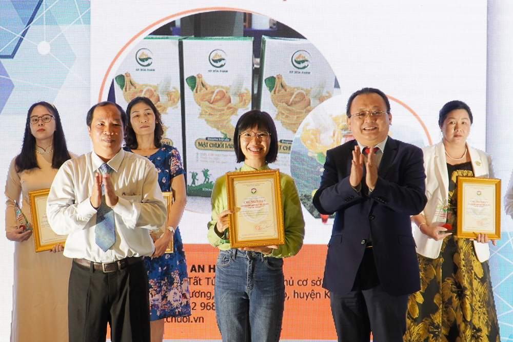 | Ông Lê Hữu Hoàng - Phó Chủ tịch thường trực UBND tỉnh Khánh Hòa (phải), ông Nguyễn Sanh Đương - Phó Giám đốc Sở Công Thương (trái) trao Giấy chứng nhận sản phẩm CNNT tiêu biểu 2023 cho đại diện cơ sở chế biến An Hòa (huyện Khánh Sơn) với sản phẩm mật chuối Tabai An Hòa. |