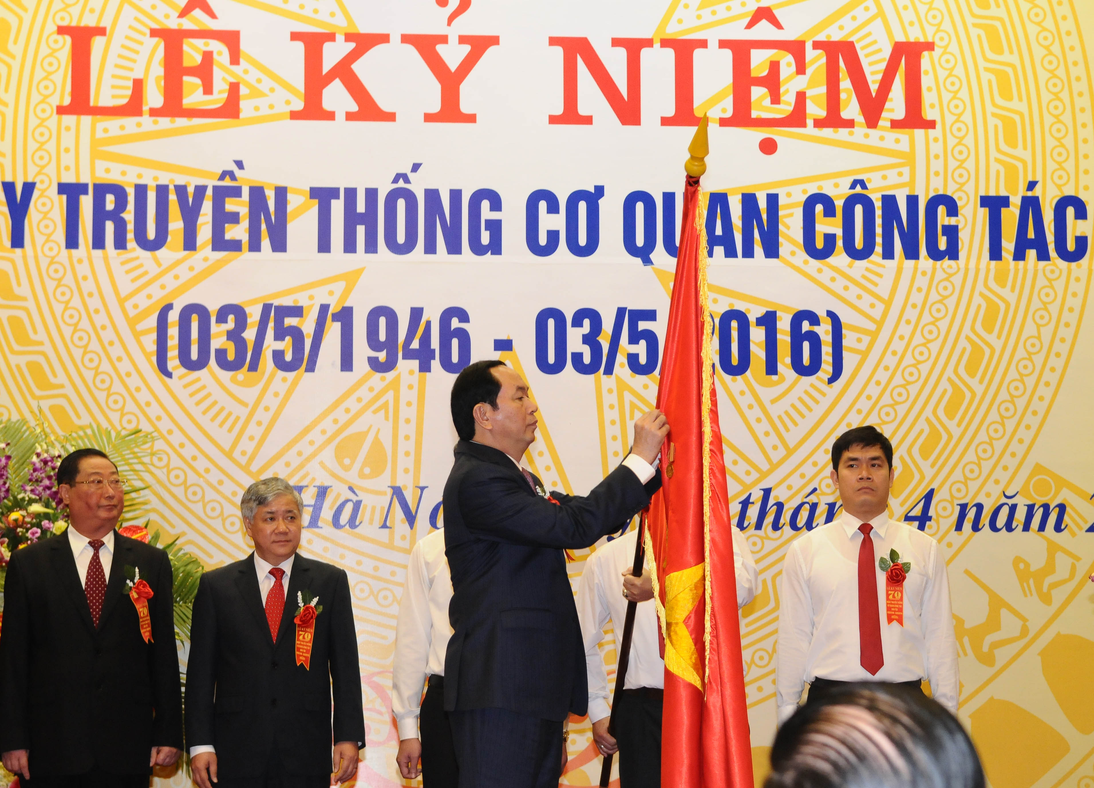 | Chủ tịch nước Trần Đại Quang đã trao Bằng chứng nhận và gắn Huân chương Độc lập hạng Nhất lên lá cờ truyền thống của UBDT |