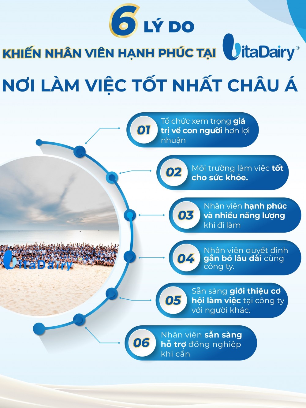 Theo kết quả đánh giá từ HR Asia khi khảo sát tại VitaDairy, có 92% nhân viên sẵn sàng hỗ trợ đồng nghiệp khi cần; 92% nhân viên cảm thấy môi trường làm việc tốt cho sức khỏe và sẵn sàng giới thiệu cơ hội làm việc tại công ty cho người khác.