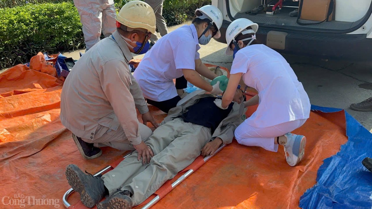 Giải pháp thực hiện, lực lượng diễn tập đã cắt điện toàn bộ Kho Vật tư tổng hợp và các hạng mục lân cận; Tổ chức quan sát đám cháy, xác định hướng gió, khả năng lan truyền của đám cháy, hướng tiếp cận để chữa cháy, xử lý sự cố; Tập trung lực lượng, phương tiện tổ chức cứu người bị nạn. Triển khai đội hình theo xe chữa cháy gồm 02 xe, phun nước làm mát, dập lửa, xử lý khói độc, hạn chế phạm vi phát tán khói, khí độc; Chuẩn bị sẵn sàng dụng cụ y tế, xe cứu thương của công ty, cử cán bộ y tế tham gia ứng phó, đề phòng có người bị nạn trong quá trình xử lý sự cố.