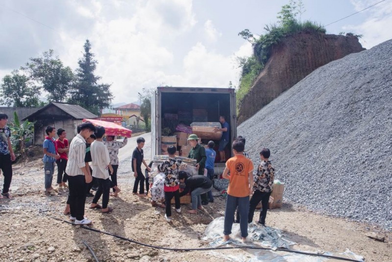 Bắt đầu từ 6h sáng tại xã Bắc Ngầm, huyện Bảo Thắng, tỉnh Lào Cai, trời mưa lớn, khi chúng tôi lên xe thì nhận được cuộc điện thoại của Thầy Hiệu trưởng trường Tiểu học Nậm Pì - thầy cho biết hiện tại khu vực trường đang mưa rất to, một số điểm vào trường có hiện tượng sạt lở, thầy lo lắng đoàn sẽ không vào trường được. Tuy nhiên, với quyết tâm mang Trung thu đến cho các cháu học sinh, anh em trong đoàn vẫn quyết định di chuyển. Sau hơn 6h di chuyển liên tục, chúng tôi đã có mặt tại điểm rẽ vào trường Tiểu học Dân tộc bán trú Nậm Pì, tuy nhiên do trời mưa nên đường yếu, xe tải chở đồ không thể đi vào được, ngay lập tức phương án nhờ xe tải nhỏ được đề xuất, chúng tôi chuyển đồ sang xe tải nhỏ, các thầy cô giáo thì sử dụng xe máy để chở đồ vào trường. Mặc dù trường chỉ cách điểm tập kết 4km nhưng chúng tôi phải di chuyển mất gần nửa tiếng.