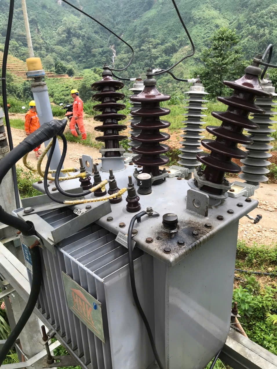 | Công nhân Điện lực Vị Xuyên kiểm tra và chỉnh trang lại TBA 320kVA/35/0.4kV tại thị trấn Việt Lâm. Ảnh:ĐLVX |
