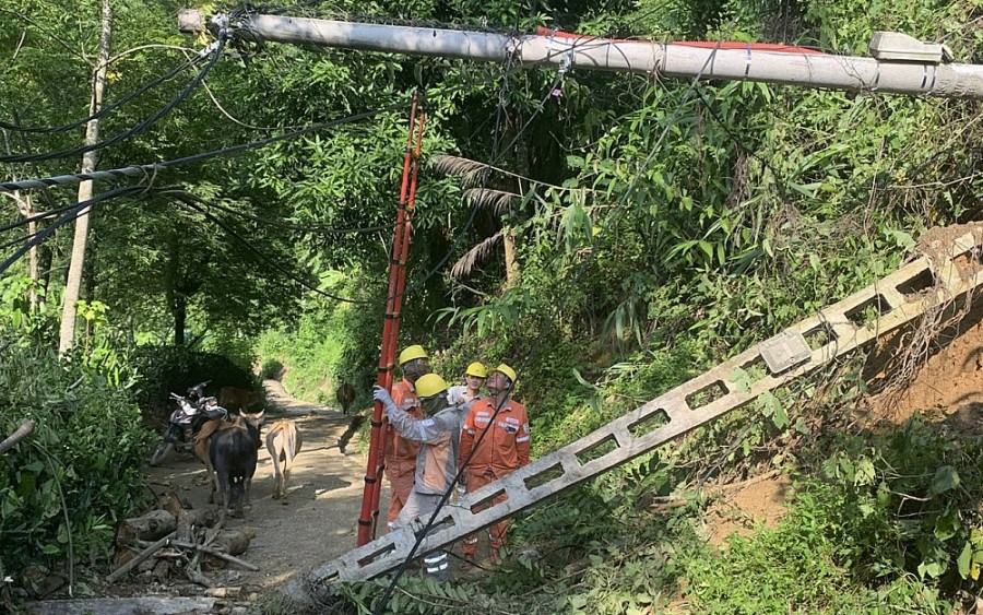 | Công nhân Điện lực Kỳ Sơn khắc phục cột gãy đổ do mưa lũ đêm 4/9 trên địa bàn xã Bảo Nam. |