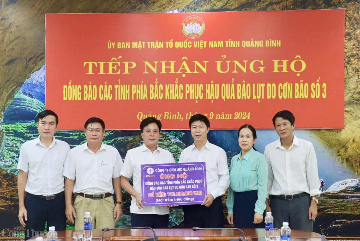 Bên cạnh huy động Đội xung kích hỗ trợ, Công ty Điện lực Quảng Bình đã kêu gọi CBCNV quyên góp ủng hộ 1 ngày lương chia sẻ với đồng bào miền Bắc đang bị thiên tai, bão lũ. Sáng 12/ 9, lãnh đạo Công ty đã trao số tiền ủng hộ 100 triệu đồng đến Ủy ban Mặt trận Tổ quốc Việt Nam tỉnh Quảng Bình.