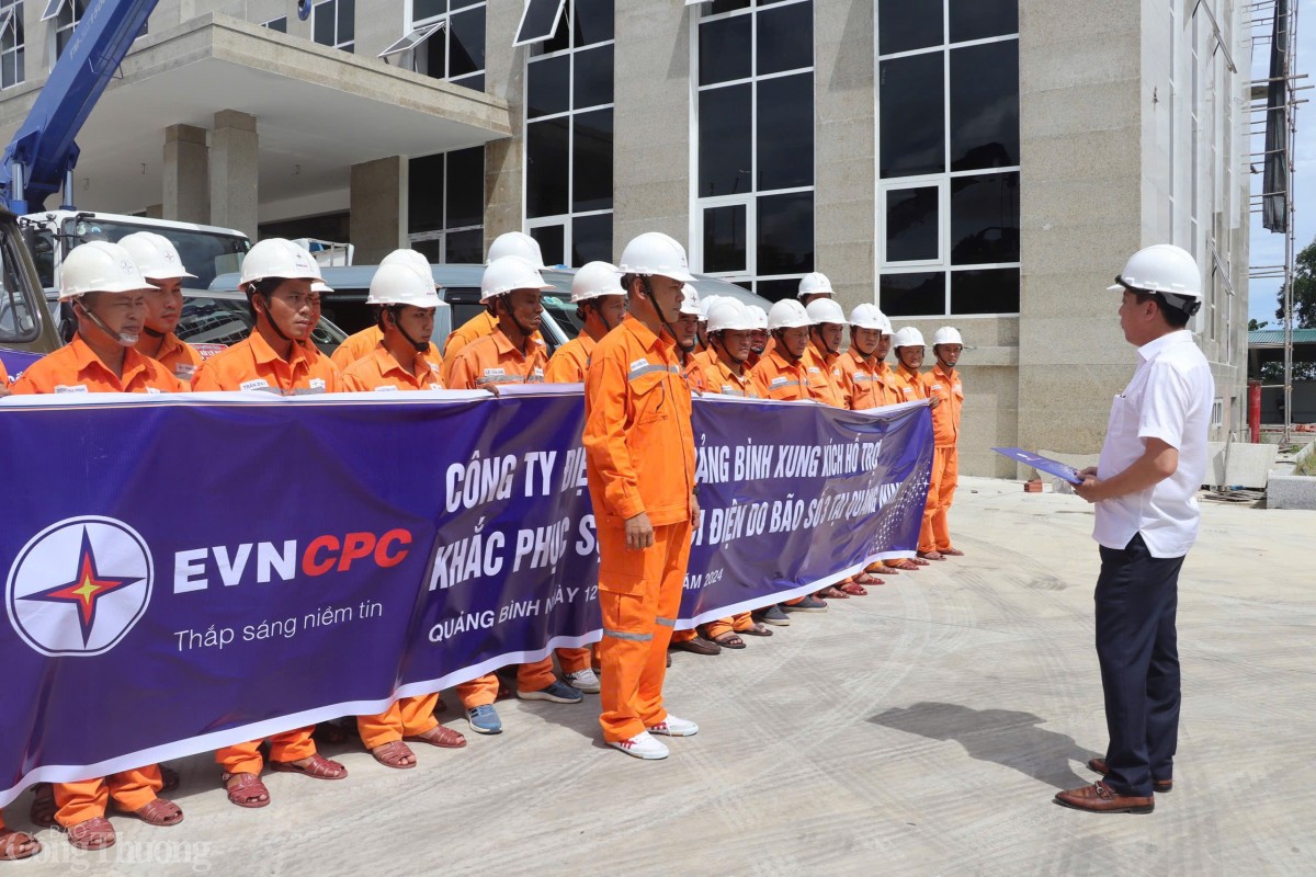 Trước khi Đội xung kích xuất phát, ông Hoàng Hiếu Trung - Giám đốc Công ty Điện lực Quảng Bình đã động viên các thành viên của đội xung kích giữ gìn sức khoẻ và đặc biệt chú trọng đến an toàn lao động trong quá trình công tác. “Với kinh nghiệm và bản lĩnh của những người lính áo cam thường xuyên đối mặt do mưa lũ, tôi tin rằng các anh sẽ phối hợp tốt với các đơn vị tại hiện trường, đồng tâm hợp lực để nhanh chóng khôi phục lưới điện, phục vụ việc cấp điện lại cho người dân Quảng Ninh để nhanh chóng ổn định cuộc sống”, ông Trung nhấn mạnh.