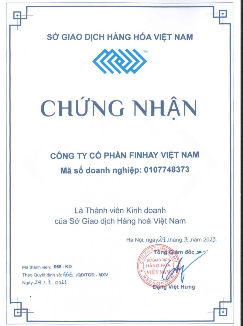 Ngày 24 tháng 7 năm 2023, Công ty cổ phần Finhay Việt Nam chính thức nhận Quyết định số 666/QĐ/TGĐ-MXV công nhận tư cách Thành viên Kinh doanh số 065 của Sở giao dịch Hàng hóa Việt Nam (MXV).