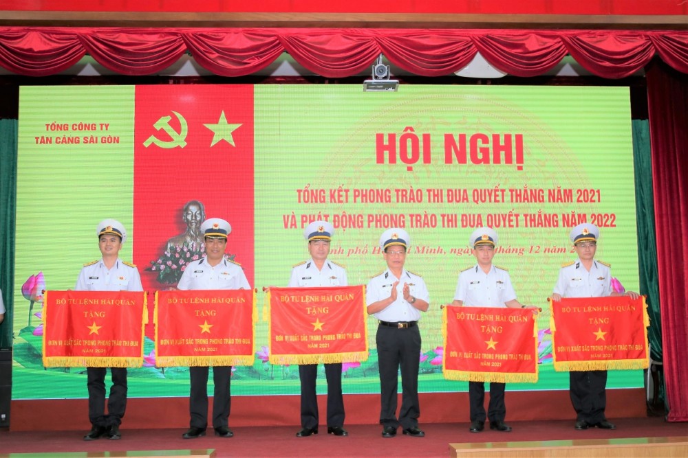 | Đại tá Hoàng Thanh Bình, Giám đốc Công ty Hoa tiêu Tân cảng (người đứng thứ 2 từ trái qua) nhận Cờ thưởng của Bộ Tư lệnh Hải quân năm 2021 |