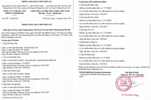 Công ty Ladophar có thông báo số 407/LDP/2022 về việc thay đổi nhân sự