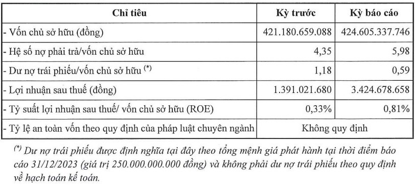 Ngoài ra, dư nợ trái phiếu/vốn chủ sở hữu giảm từ 1,18 lần xuống 0,59 lần, tương ứng còn khoảng 250 tỷ đồng. Lợi nhuận sau thuế tăng từ gần 1,4 tỷ đồng lên hơn 3,4 tỷ đồng. Tỷ suất lợi nhuận sau thuế / vốn chủ sở hữu (ROE) tăng từ 0,33% lên 0,81%