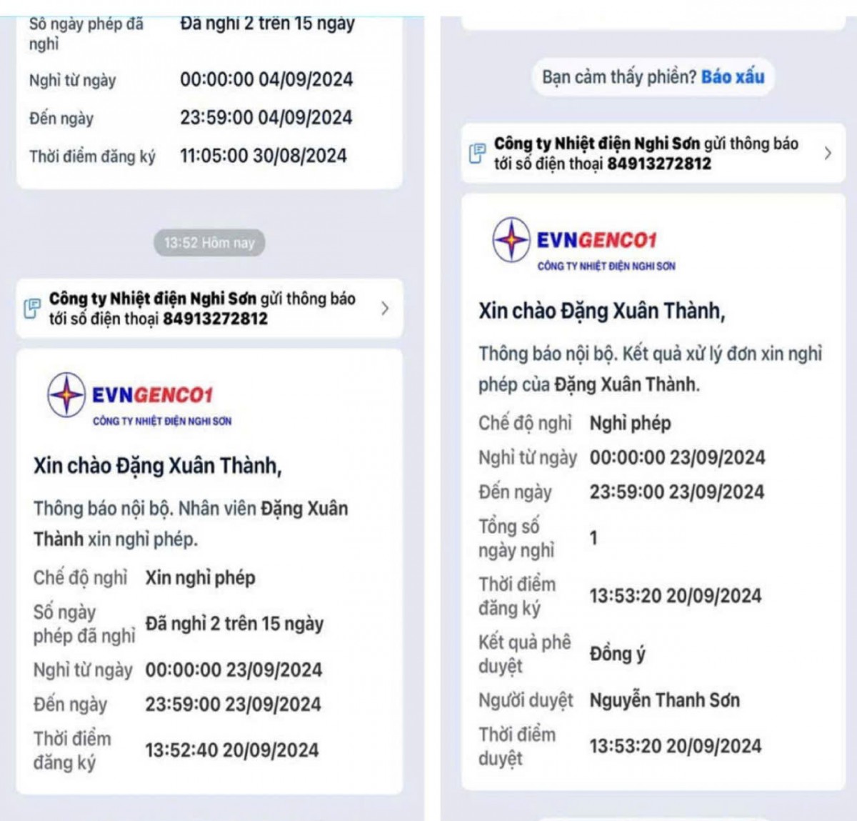 Khi người sử dụng thực hiện đăng ký nghỉ phép trên hệ thống sẽ có một tin nhắn hiện thị trên ứng dụng Zalo của người đăng ký thông báo đăng ký thành công, và một tin nhắn hiện thị trên Zalo của người có thẩm quyền phê duyệt để thông báo có yêu cầu xem xét. Khi người có thẩm quyền phê duyệt thực hiện chấp nhận hoặc từ chối đều có kết quả cho người đăng ký, người phê duyệt, người theo dõi chấm công của phòng, phân xưởng.