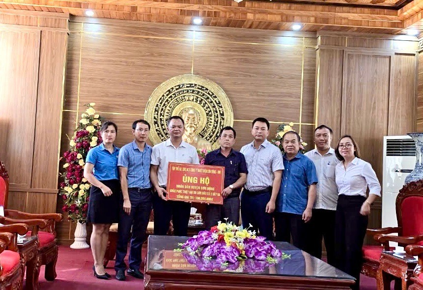 | Ông Ngô Trí Thịnh - Tổng giám đốc Tổng công ty trao tiền hỗ trợ nhân dân huyện Sơn Động với số tiền 300.000.000 đồng |