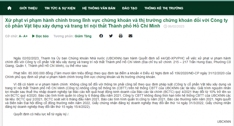 Theo thông tin mới công bố trên Cổng thông tin của Ủy ban Chứng khoán Nhà nước (UBCKNN), ngày 02/02, đơn vị này đã ban hành Quyết định số 44/QĐ-XPVPHC về việc xử phạt vi phạm hành chính đối với Công ty Cổ phần Vật liệu xây dựng và trang trí nội thất TP Hồ Chí Minh (Nội thất TP Hồ Chí Minh, địa chỉ tại số 215 – 217 Trần Hưng Đạo, Phường Cô Giang, quận 1, TP Hồ Chí Minh).