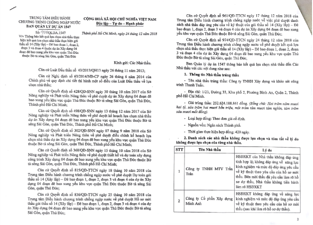Quyết định số 998/QLDA.1547 có viết, để trúng gói thầu, Công ty Thanh Tuấn đã vượt qua 2 đối thủ là Công ty TNHH MTV Trần Trân và Công ty Cổ phần Xây dựng Minh Anh một cách ngoạn mục, theo đó lý do bị loại cùng là "Hồ sơ đề xuất kỹ thuật không đáp ứng tính hợp lệ, không đáp ứng về năng lực, kinh nghiệm, kỹ thuật theo yêu cầu của hồ sơ mời thầu"...