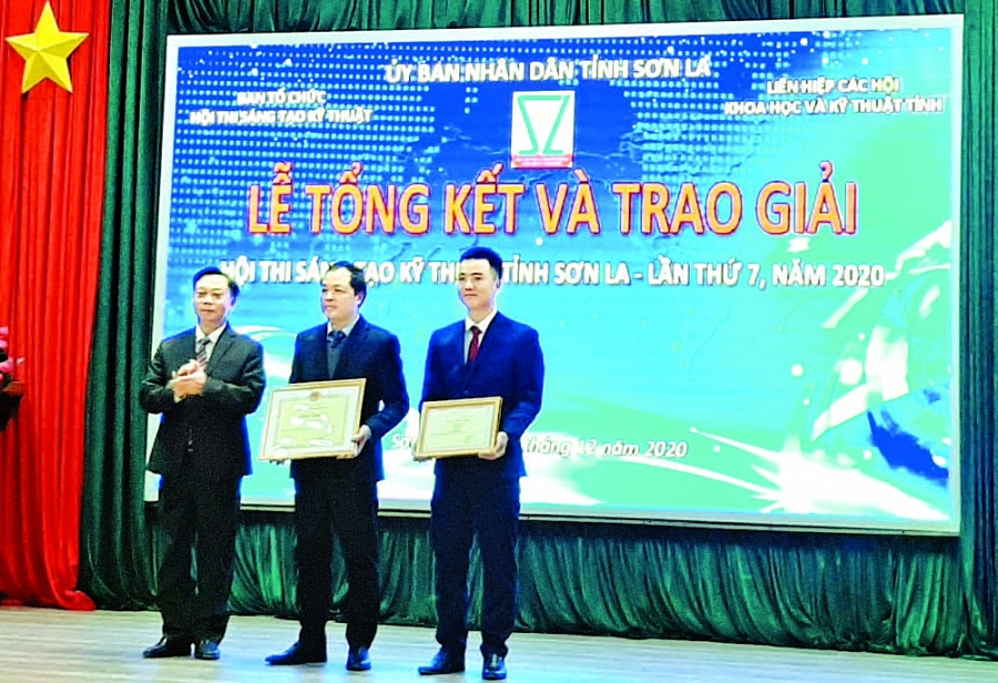 | Ông Khương Thế Anh - Giám đốc Công ty Thủy điện Sơn La (giữa) và kỹ sư Đỗ Việt Bách nhận giải tại Lễ tổng kết và trao giải Hội thi Sáng tạo kỹ thuật tỉnh Sơn La năm 2020 |