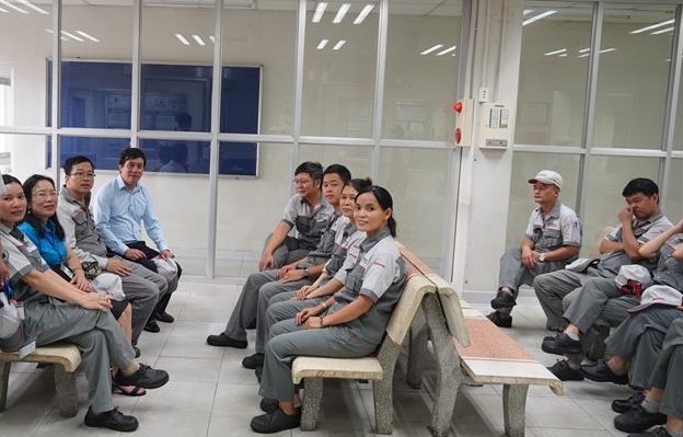 Ông Phan Văn Bản - Chủ tịch Công đoàn Công Thương Việt Nam thăm hỏi, động viên người lao động trực tiếp sản xuất tại công ty |