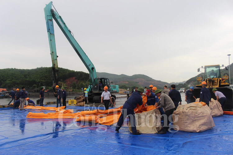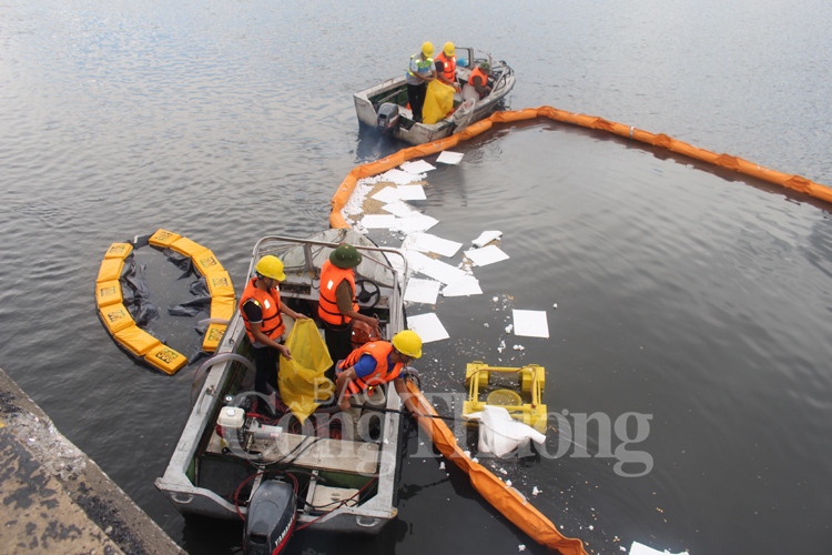 Ở dưới sông, lực lượng ứng phó tiến hành rải phao quây khống chế dầu tràn ban dầu bằng phao thấm dầu 0S20060 và các khâu quây dầu tràn trên biển bằng phao quây chuyên dụng, thả sơ bông thấm dầu, sử dụng máy bơm hút dầu tràn vào xuồng công tác, dùng vợt vớt dầu vào túi thấm dầu...cũng đạt yêu cầu.