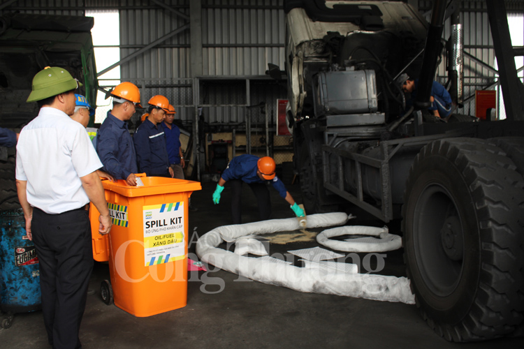 Cuộc diễn tập sự cố tràn dầu năm nay với các tình huống giả định. Trên cạn, trong quá trình bảo dưỡng và thay dầu cho xe vận tải than, không may két dầu bị thủng, hàng chục lít dầu tràn ra nền nhà khu vực sửa chữa tại xưởng sửa chữa xe cơ giới thuộc phân xưởng sửa chữa cơ khí. Ở dưới nước, với tình huống giả định 2 xà lan vào nhận than tại cụm bến số 3 khu vực Cảng Làng Khánh 2, do gió to sóng lớn đã va chạm mạnh vào nhau và xảy ra sự cố tràn trên 300 tấn dầu trên sông Diễn Vọng.