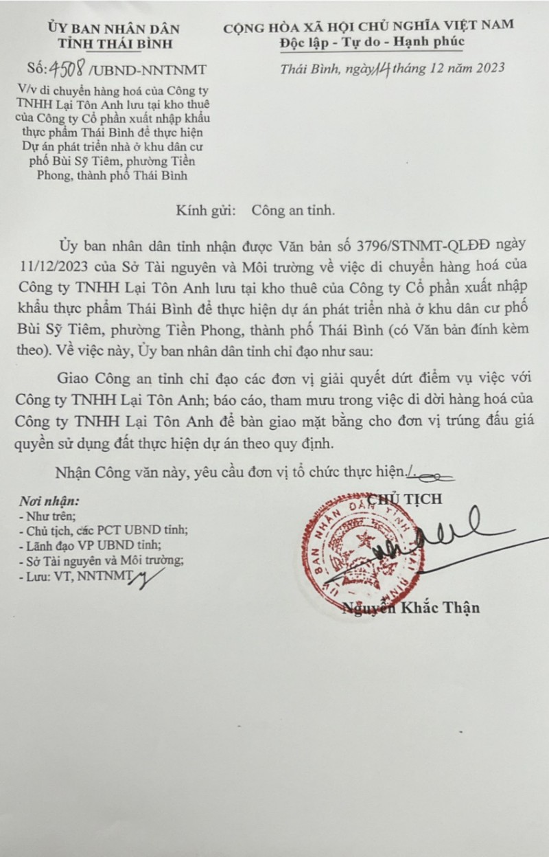 Ngay sau đó, ngày 14/12, UBND tỉnh Thái Bình có Văn bản số 4508/UBND-NNTNMT gửi Công an tỉnh Thái Bình về việc di chuyển hàng hóa của Công ty TNHH Lại Tôn Anh lưu tại kho thuê của Công ty Cổ phần XNK thực phẩm Thái Bình để thực hiện Dự án phát triển nhà ở khu dân cư phố Bùi Sỹ Tiêm. Theo đó, UBND tỉnh Thái Bình giao Công an tỉnh chỉ đạo các đơn vị giải quyết dứt điểm vụ việc với Công ty TNHH Lại Tôn Anh; báo cáo, tham mưu trong việc di chuyển hàng hóa của công ty để bàn giao mặt bằng cho đơn vị trúng đấu giá theo đúng quy định. Nhận được công văn này, UBND tỉnh Thái Bình yêu cầu đơn vị tổ chức thực hiện.