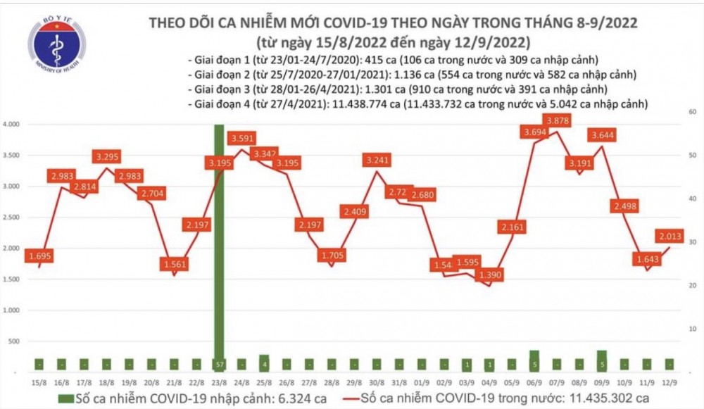 Bản tin Bộ Y tế về chống dịch Covid-19 hôm nay 12/9: Cả nước có 2.013 ca Covid-19, số ca mắc mới tăng gần 600 người so với hôm qua.