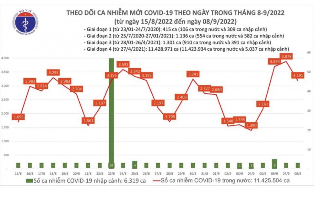 Tin Covid-19 hôm nay 8/9: Kể từ đầu dịch đến nay Việt Nam có 11.431.823 ca nhiễm, đứng thứ 12/227quốc gia và vùng lãnh thổ, trong khi với tỷ lệ số ca nhiễm/1 triệu dân, Việt Nam đứng thứ 112/227 quốc gia và vùng lãnh thổ (bình quân 1 triệu người có 115.186 ca nhiễm).