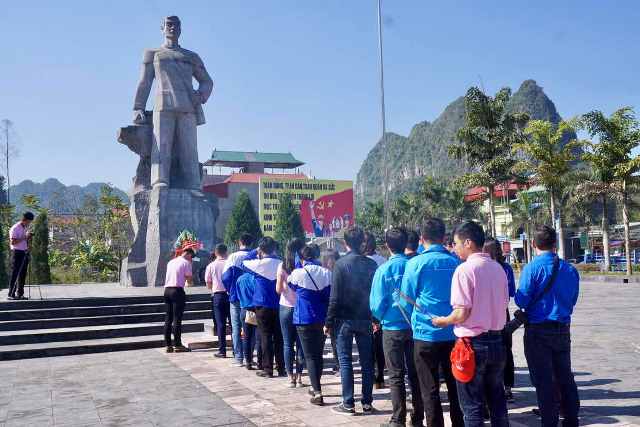| Các thành viên trong đoàn thiện nguyện tổ chức viếng tượng đài đồng chí Lương Văn Tri |