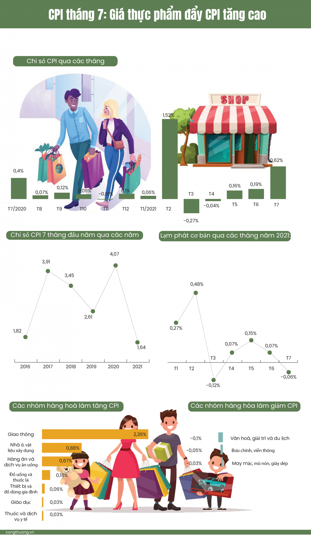Giá lương thực, thực phẩm tại một số địa phương thực hiện giãn cách xã hội nhằm phòng chống dịch Covid-19 tăng cao do người dân có tâm lý lo ngại thiếu hàng hoá đã tăng cường dự trữ. Giá xăng dầu, giá gas tăng theo giá nhiên liệu thế giới và giá điện sinh hoạt tăng theo nhu cầu sử dụng trong mùa nắng nóng là những nguyên nhân chính làm chỉ số giá tiêu dùng (CPI) tháng 7/2021 tăng 0,62% so với tháng trước.