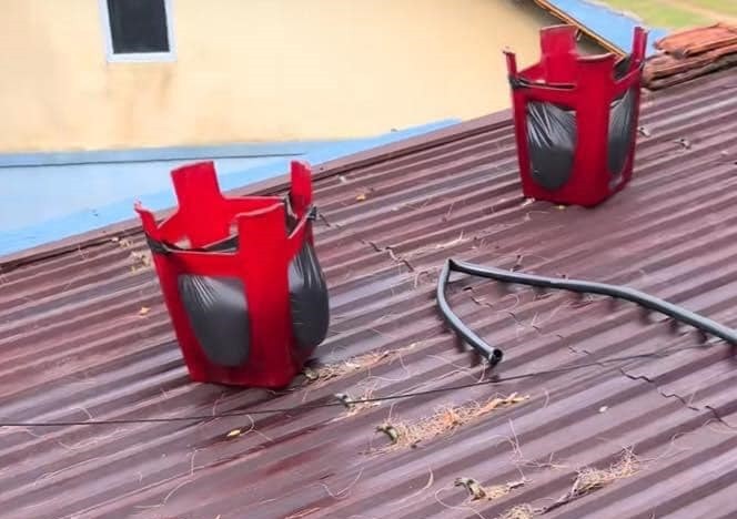 | Sử dụng túi nilon, bơm nước vào trong để tránh tốc mái. Ảnh: ST |