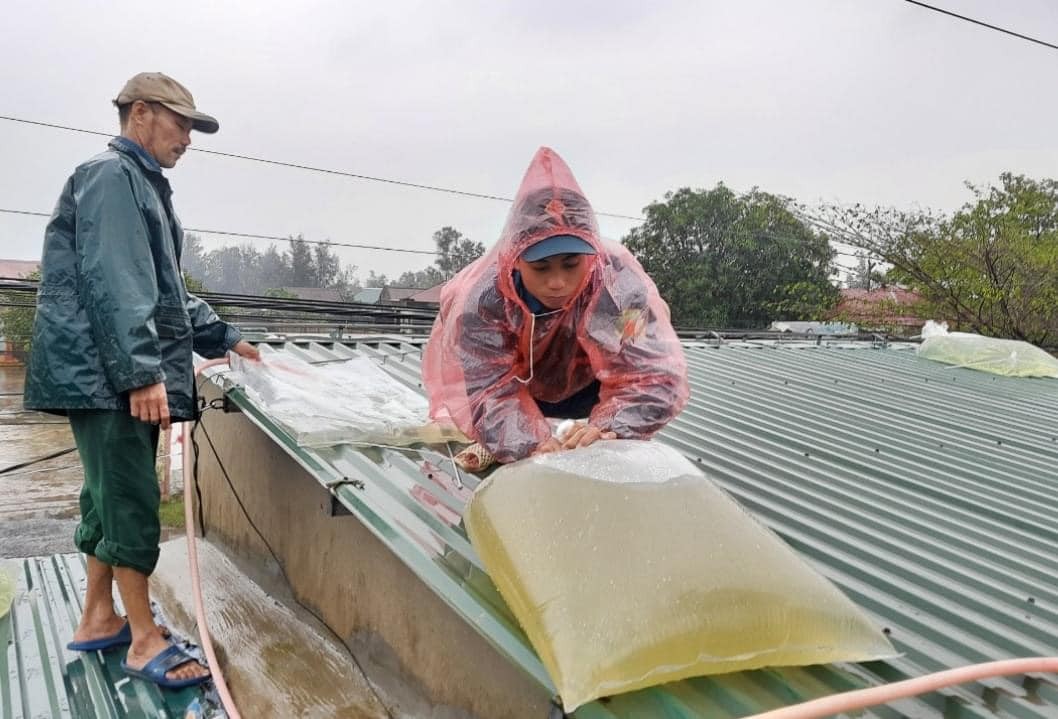| Dùng mọi vật dụng chứa nước gia cố mái nhà. Ảnh: ST |