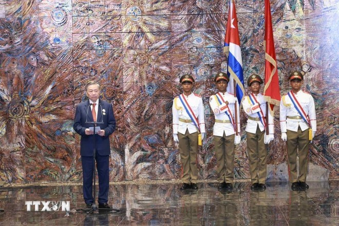 Tiếp đó là phần diễn văn của lãnh đạo Đảng, Nhà nước Cuba, nêu bật những đóng góp to lớn của Tổng Bí thư, Chủ tịch nước Tô Lâm đối với sự nghiệp xây dựng và bảo vệ đất nước Việt Nam xã hội chủ nghĩa, cũng như những nỗ lực không biết mệt mỏi của đồng chí nhằm vun đắp và củng cố mối quan hệ đoàn kết, hữu nghị và hợp tác giữa Đảng, Nhà nước và nhân dân hai nước.