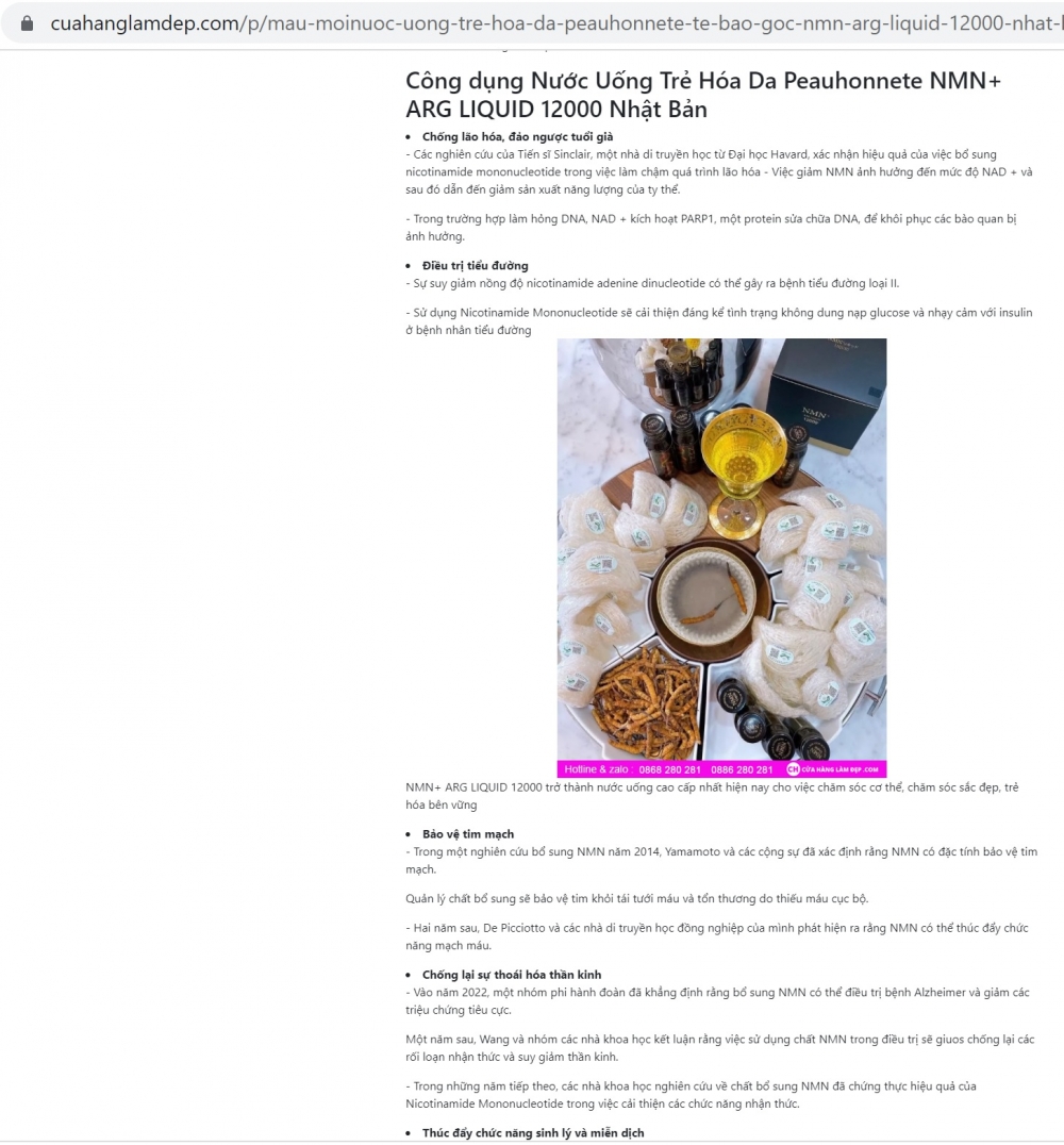 | Thực phẩm bảo vệ sức khỏe Peauhonnête NMN + ARG Liquid 12000 vi phạm quy định pháp luật về quảng cáo. Ảnh chụp website |