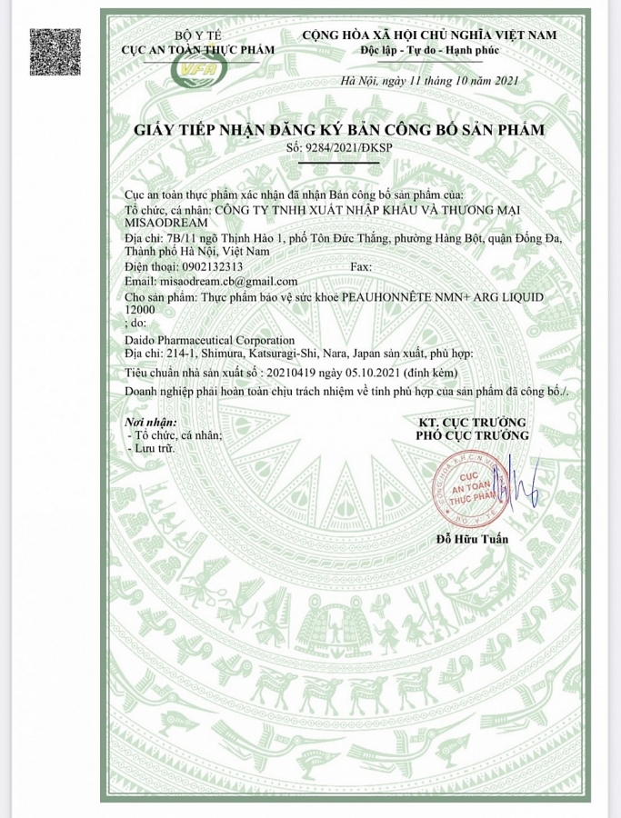 Sản phẩm Peauhonnête NMN ARG Liquid 12000 do Daido Pharmaceutical Corphoration (địa chỉ ở 214-1, Shimura, Katsuragi-Shi, Nara, Japan) sản xuất và Công ty TNHH Xuất nhập khẩu và Thương mại Misaodream (địa chỉ ở 7B/11 ngõ Thịnh Hào 1, phố Tôn Đức Thắng, phường Hàng Bột, quận Đống Đa, Hà Nội) công bố và chịu trách nhiệm sản phẩm.