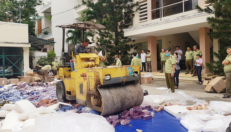 Tổng số sản phẩm hàng hóa bị tiêu hủy trong đợt này là tang vật vi phạm hành chính đã bị lượng lượng QLTT tỉnh Khánh Hòa (Đội QLTT số 1, đội số 2, đội số 4 và đội số 6) tiến hành xử lý tịch thu qua các đợt kiểm tra, kiểm soát thị trường theo đúng các quy định của pháp luật hiện hành. Trong đó, chiếm nhiều nhất là các loại sản phẩm mỹ phẩm, nước hoa (gần 5.300 sản phẩm bị tiêu hủy); trên 4.000 sản phẩm ba lô, túi xách, ví, dây nịt, giày dép, tất, vải; gần 1.000 đồng hồ đeo tay nam nữ các loại; gần 300 trăm đơn vị sản phẩm thuốc lá điện tử, phụ kiện thuốc điện tử các loại; 210 sản phẩm cáp sạc điện thoại và hàng ngàn sản phẩm khác như đồ uống có cồn, rượu, đồ chơi trẻ em, thực phẩm chức năng, gối, sữa, trà, lăn khử mùi… Lực lượng QLTT Khánh Hòa dùng búa tạ, dao, kéo phá hủy thủ công, CQLTT đã huy động xe lu nghiền nát tất cả các sản phẩm nước hoa cùng các loại sản phẩm khác, sau đó xe chuyên xử lý rác của Công ty môi trường đo thị đến thu gom…